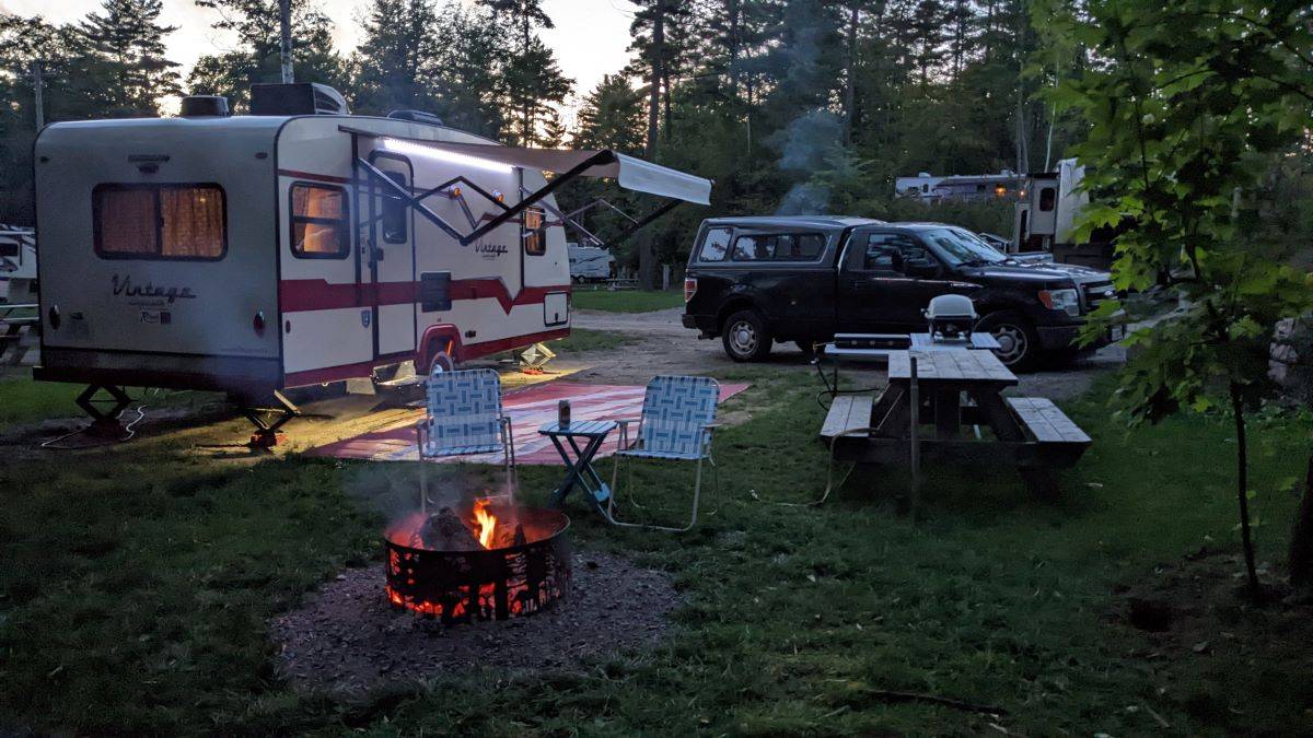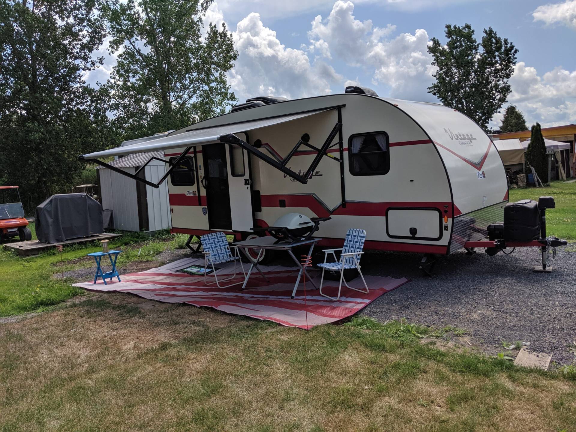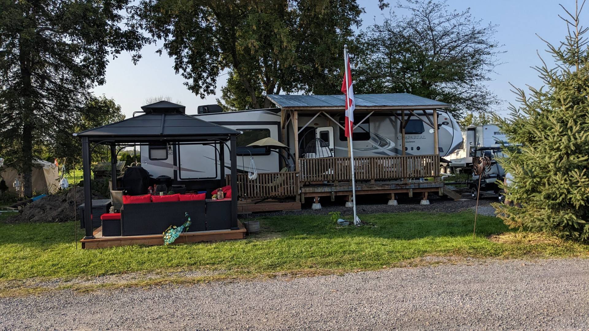 Ok what really happened involved a decision made in a moment of absolutely questionable clarity and we bought a 5th wheel. Only then did we realize how big it was (43 feet) but our truck couldn’t move it . Luckily our campground was just up the road. Our RV dealership was more than happy to deliver it to our seasonal site! In fact they actually retrieved our old trailer and parked so that we could literally put down a plank and move everything across right in their parking area. Problem solved!